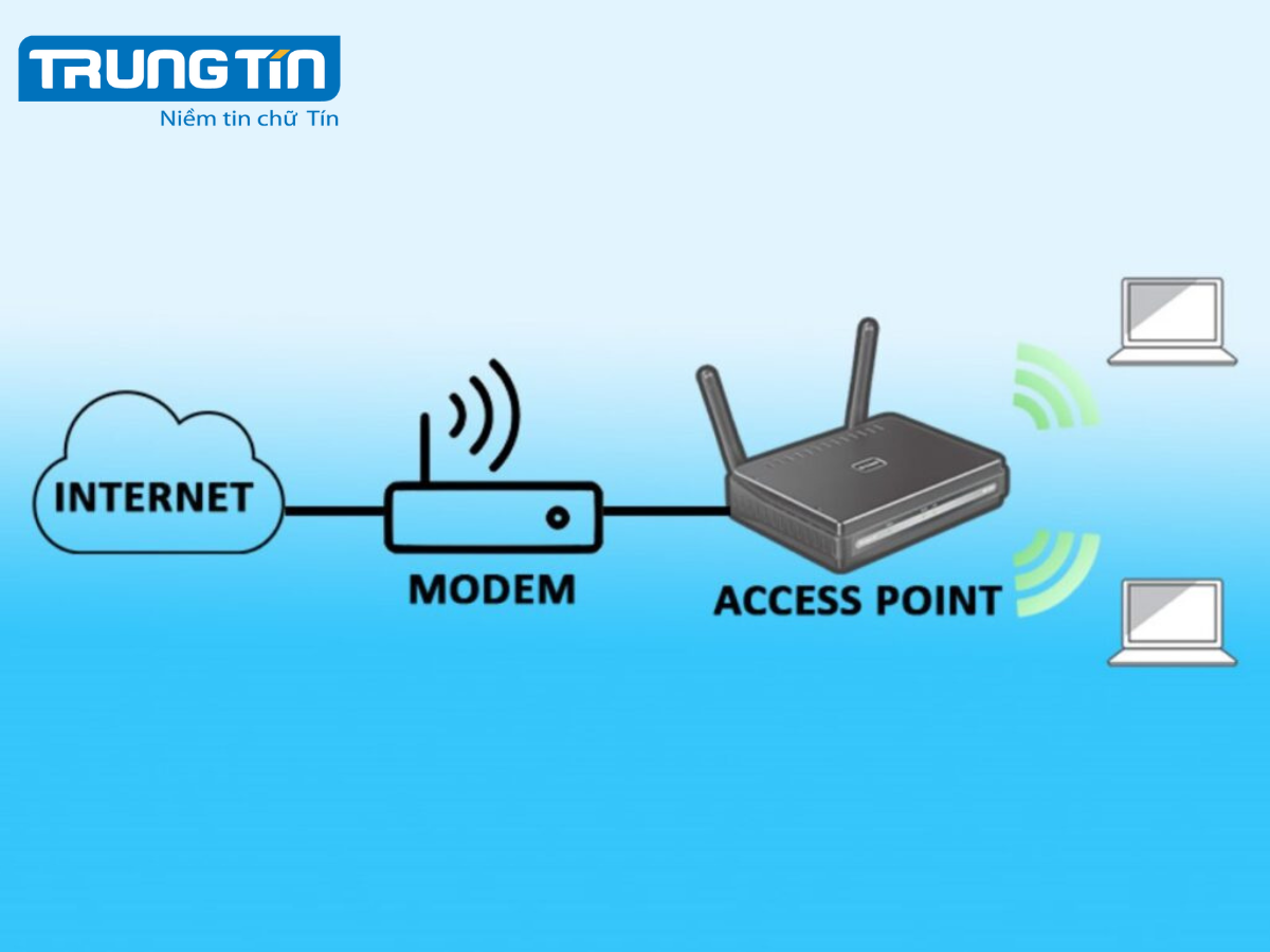 - Access Point chỉ có nhiệm vụ phát sóng Wi-Fi, cần kết nối đến router hoặc switch mạng. Trong văn phòng lớn, nên dùng nhiều Access Point để phủ sóng toàn bộ không gian.